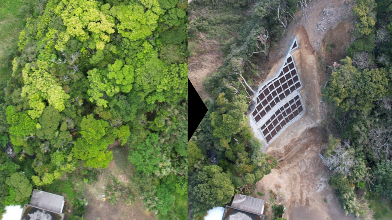 道路整備(交付金)工事(増田R6-2工区) 本工事は、中種子町増田地区の道路改良工事で、狭く歩道のなかった旧道の代わりに新設で道路を引き直す工事でした。山林部分の伐採・造成、盛土工事、側溝などの構造物敷設などをおこないました。