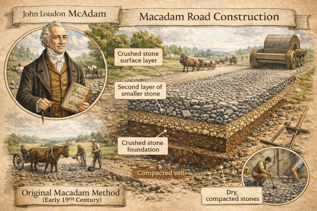ポイント:「粒の大きさを揃え、締固めで強くする」という材料工学的な発想。マカダムと聞けばローラーを思い出しますが機械名の由来になっている人物です。