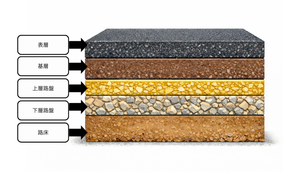 - 路床:地盤(改良の有無が寿命に直結)